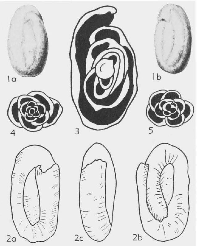 Fig. 330,1-5. *A. pusilla (Geinitz), U.Carb.(Namur.), Czech., la,b, opposite sides, X117 (*1985), 2a-c, opposite sides and edge view showing nonseptate character, X25, 3, long. sec. of megalospheric form, X55, 4,5 , transv. secs. of microspheric and megalospheric forms, X25 (*2070).