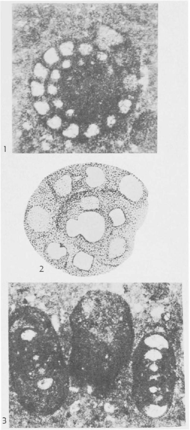Fig. 335,1-3. *N. oolithica, Raurac. ( 1,2 ), Sequan. (3), 1 , equat. sec., X75, 2 , equat. sec., central portion enlarged to show planispiral development, X230, 3, axial secs., X75 (*1297).