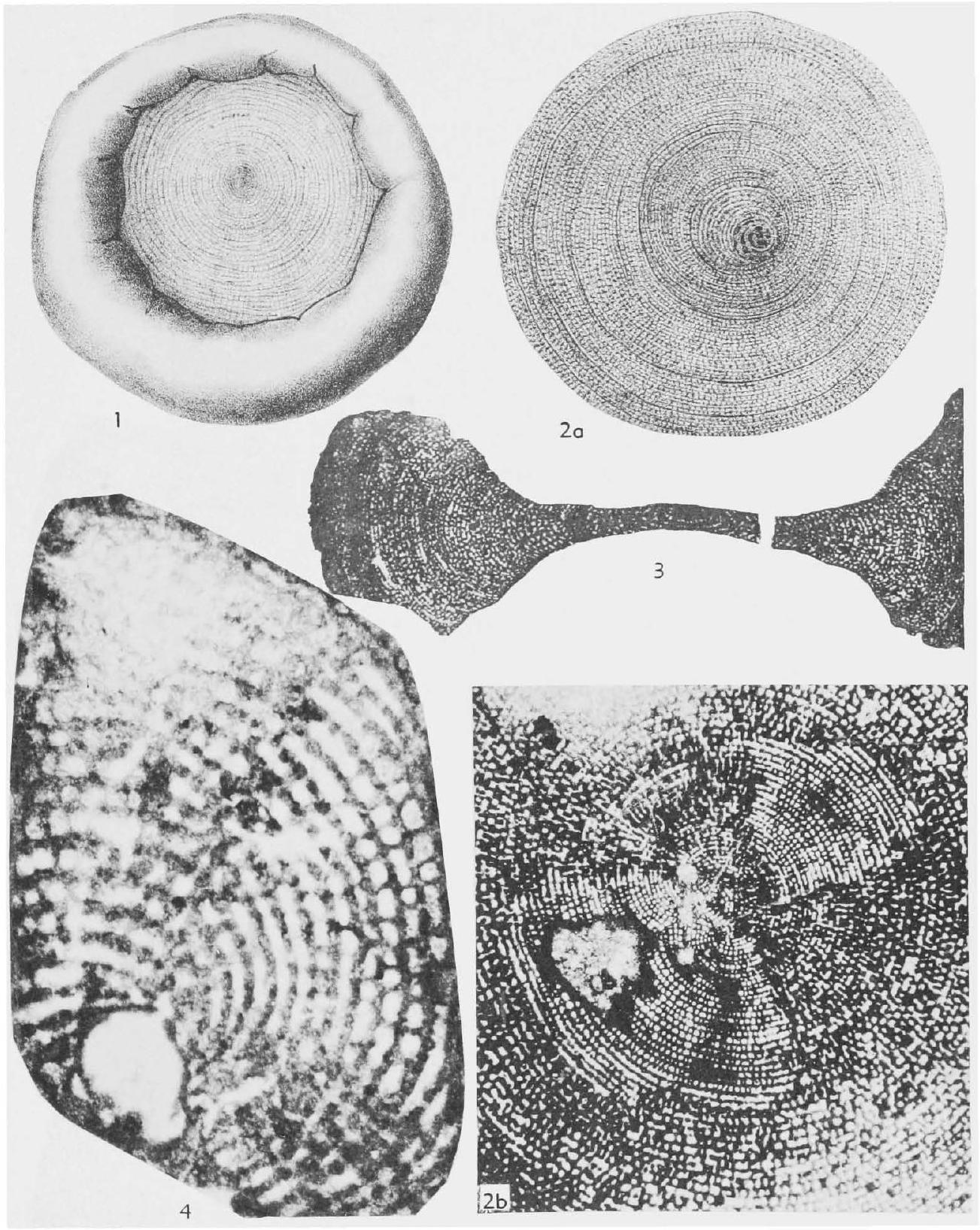 Fig. 214,1-3. *O. praectursor (Gümbel), L.Jur.(Lias. ), Roveredo Tyrol Alps, 1, ext. (as O. circumvulvata), X10 (*841), 2a, equat. sec., X10 (*841), 2b, central portion of equat. sec., X14 (*788), 3, axial sec., X9 (*788). --Fig. 214,4 . O. primaeva (Henson), U.Trias. or L.Jur., SW.Asia(Ornan), probably megalospheric syntype (BMNH P35788), X60 (*2115).
