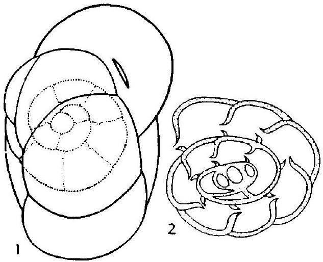 Fig. 136,9. *R. contortus, Rec., Antarctic, 9a,b, opposite sides, 9c, edge view, all X44 (*2117). --Fig. 138,1. R. trochamminiforme Höglund, Rec., Sweden, diagram of progressive change in coiling plan, X175 (*924). --Fig. 138,2. R. laevigatum Höglund, Rec., Sweden, sectioned specimen showing position of aperture and change in direction of coiling, X155 (*924)