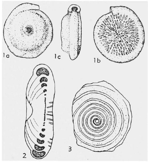 Fig. 609,1-3. *S. clari, 1a-c, opposite sides and edge views of holotype, 2 , axial sec., 3 , equat. sec., all X35 (*1057)